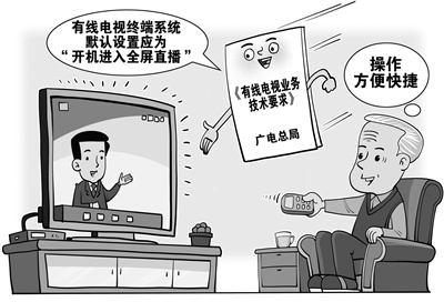 记者27日从国家广播电视总局获悉,广电总局日前发布了《有线电视业务技术要求》等三项广播电视和网络视听行业标准的通知,要求有线电视终端应提供“开机进入全屏直播”和“开机进入突出直播频道的交互主页”两种“开机模式”选项,系统默认设置应为“开机进入全屏直播”。(11月27日 新华社)□朱慧卿