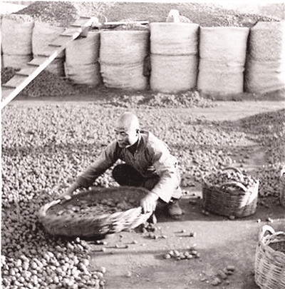 煤厂子因占地面积大,多作加工煤球及批发生意,而煤铺相对来说比煤厂子的规模要小,多由煤厂子批煤,经过加工,摇成煤球,卖给住户。早年间北京大街小巷,只要看到粉白的墙上写着“南山高末”“西山硬炭”或“乌金黑玉”的字样,就知道是煤厂子或煤铺,有的煤铺不仅卖煤球,也卖煤块儿、劈柴,过了中秋以后生意最为红火,而开设煤铺的掌柜子和伙计大多是河北定兴人,老北京人管他们叫“摇煤球的”。过去有一句老话:“定兴县,三宗宝,开澡堂子带修脚,摇煤球的也不少。”不少在京城谋生的定兴人,有的在煤铺干活,也有的利用农闲走街串巷,为那些积存了煤末的机关或住户摇煤球。摇煤球的工具很简单,有铁锨、板儿锹、钉耙、剁铲、摇筐、转盆等。其头道工序是把煤沫子、碎煤、黄土,按一定比例混合在一起,随后加水和成煤泥,摊在地上,切成均匀的小块儿,最后放在摇筐里通过旋转摇动,使煤泥变成为圆球状,待风干后就可以出售了。