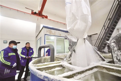 据气象部门预报,北京将迎来明显降雪,部分路段可能出现积雪结冰情况。为此,朝阳环卫中心及时启动应急预案,6000余名职工随时待命,全员、全装、全时“备战”冰雪。图为昨天上午,朝阳环卫中心融雪搅拌站已完成融雪剂的调配,以应对降温降雪天气。