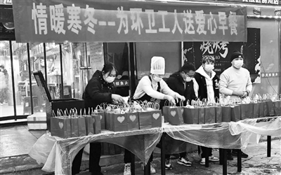 近日,笔者读到两条免费早餐送户外劳动者的新闻。一条是央视网报道:12月12日清晨,在武汉黄陂街头发生了暖心的一幕:300余份免费爱心早餐被送到了一线环卫工人手中,让他们在寒冷的冬日感受到了温暖。另一条是12月16日的中工网报道,为了更好关心关爱户外职工、就近就便为户外职工解决实际困难,上海市松江区永丰街道总工会于近日开展户外职工送“暖心早餐”活动,让在寒冷天气下辛苦劳作的户外工作者感受到工会“娘家人”的温暖呵护。