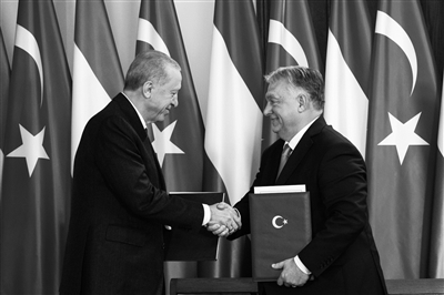 图为在匈牙利布达佩斯,匈牙利总理欧尔班(右)与土耳其总统埃尔多安签署协议后握手致意。