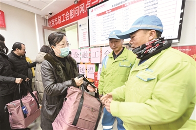 本报讯 (记者 刘欣欣)“这几天特别冷,来咱们银行的暖心驿站喝点热水就觉得暖和了不少,感谢市金融工会惦记着我们快递小哥,送来这么多实用的暖心物资。”正在北京农商银行城市副中心分行潞城支行户外劳动者暖心驿站休息的韵达快递小哥接过慰问包,笑容灿烂地说。
