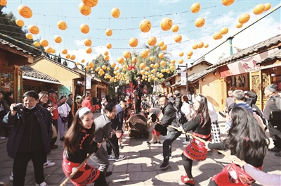 2024年将至,人们参加形式多样的欢庆活动,迎接新年。图为在云南省昆明市云南民族村,游客与佤族演员一起体验拉木鼓。