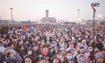 新年第一天清晨,7.3万人齐聚天安门广场,在庄严的国歌声中,共同见证鲜艳的五星红旗冉冉升起。人们放声高歌、挥舞小国旗、拍摄记录,每个人的脸上都洋溢着幸福和欢乐,写满了骄傲和自豪,迎接2024年的第一缕阳光。