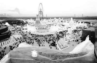割冰、运冰、砌冰、雕冰……一块块冰经过“升华”之旅,化身成玲珑冰雕,最终融入冰雪大世界、冰灯艺术游园会等各处冰建景观之中。
