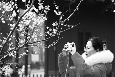 近日,南京明孝陵景区腊梅和梅花竞相绽放,暗香浮动,为寒冷的冬日增添了一抹亮色。图为游人在景区拍摄腊梅。 新华社发