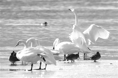 近日,在甘肃省兰州市西固区达川镇境内的三河口天鹅滩,多只天鹅在此栖息越冬。三河口是黄河、湟水河、大通河的汇流之处,近年来,当地着力推动黄河流域综合治理,生态环境持续向好,为候鸟提供栖息地。 新华社发
