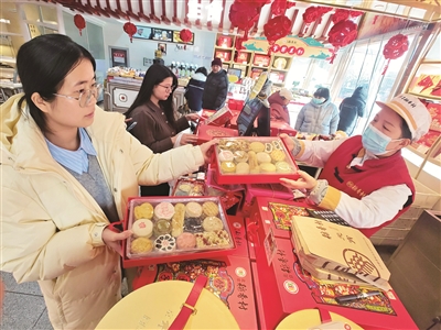 春节临近,北京稻香村年货礼盒近日“出炉”。今年,稻香村推出5款糕点礼盒和2款熟食礼盒。兼具颜值和美味的“京城颂福”礼盒将祥云、福袋等吉庆的祝福一应装进了点心匣子里,传统的“京八件”则用精致的糕点和喜庆的红色礼盒赢得了顾客喜爱。本报记者 孙妍 摄影报道