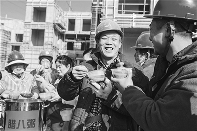 1月15日,浙江省湖州市长兴县雉城街道回龙山社区一处建筑工地旁,党员志愿者将精心熬制的腊八粥免费派送给建筑工人,为他们送去温暖。(1月16日《工人日报》)