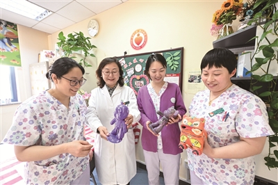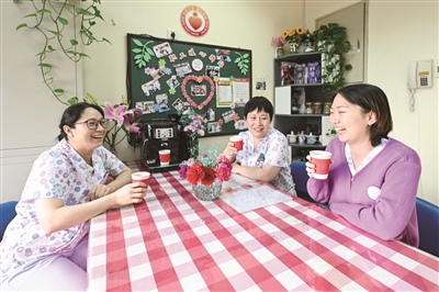 走进位于住院楼南楼的综合病房暖心驿站,近20平方米的狭长空间内布满绿植,配备有空调、电视、冰箱和咖啡机等设施。墙壁上挂满了科室医护人员的集体活动合影和生活照。4名医护人员正在暖心驿站小憩,练习瑜伽、饮用咖啡。“这里原先是药剂科的一个小仓库,光线昏暗。医院因地制宜将其改造为阳光房,现在的环境干净亮堂、生机勃勃。”北京儿童医院综合病房护士长、综合病房暖心驿站负责人唐亚玫说,医护人员在这里放下疲惫,增进了彼此的沟通交流。摆放在室内的小熊玩偶和纸艺花卉,都是大家亲手制作的。科室医护人员共同精心布置这个温馨的“家”,多项活动陆续在这里开展。