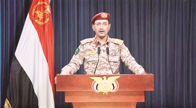 图为也门胡塞武装发言人叶海亚·萨雷亚发表声明。