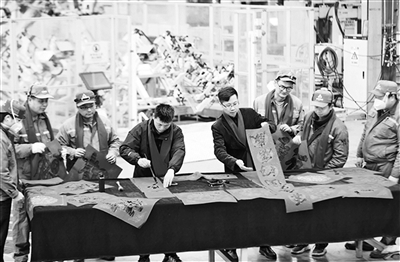 1月16日,浙江省湖州市莫干山高新区、德清县阜溪街道总工会组织书法家志愿者走进企业车间,为工人写春联、送福字。(1月19日《工人日报》)