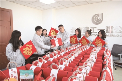 随着春节的临近,北京建工一建公司工会为职工们准备了一大波年味十足的新春福包,既有扶贫特色农产品,也有福字、灯笼等喜庆礼包。在“两节”送温暖基础上,该公司工会还针对春节期间坚守岗位留岗过年的职工提供形式多样的关爱服务,以满足节日期间职工生活、文化、娱乐方面的需求。