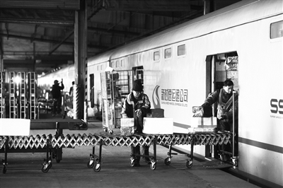 近日,黄村铁路货场内,随着满载家用电器、食品饮料、日用百货、油粮米面等年货的X104次特快货物班列稳稳停靠站台,作业人员快速有序地卸车、分拣,随后将货物装入汽车,第一时间运往北京市民手中。为保障春节年货市场的供应稳定,加速货物运输速度,中国铁路北京局集团有限公司持续开行特快货物班列,截至1月30日,已通过特快货物班列运输货品760万件。本报记者 彭程 摄影报道