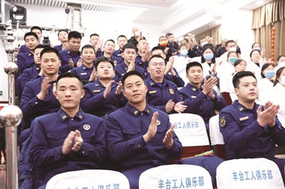 劳动创造幸福,实干成就伟业。活动现场,“最美人民警察”——全国特级优秀人民警察傅天雷讲述如何通过个人的微光成炬,照亮玉林里社区;北京市公安局丰台分局警官合唱团用刚柔并济的和声让在场的每一位劳动者都仿佛置身在灿烂阳光下;丰台消防救援支队年轻的消防员们伴着电声乐唱出了深厚的家国情怀,用有力的手臂敲响盛世之鼓,激发出在场劳动者的奋进之力。