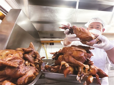 春节临近,京城各家老字号都拿出了特色美食让市民大饱口福。记者昨天在护国寺小吃地安门店看到,上午10点多,这里已经排了不少顾客等待扒鸡出锅。据该店工作人员介绍,连日来店里的特色扒鸡每天限量在三四百只,是平时的五倍,仍然供不应求,目前已经安排师傅24小时轮班,以保证市场供应。