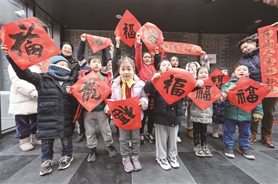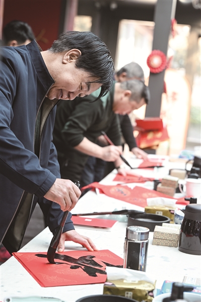 压纸、沾墨、起笔、收笔……5位职工书法家凝神聚气、悬腕挥毫。一停一顿、一起一落间,一副副寓意吉祥的春联跃然纸上。“福满乾坤万众安 春回山野百花艳”,中国职工书法家协会副主席、北京职工书画协会驻会副会长吴传义书写着春联,“劳动人民文化宫有着深厚的文化底蕴。通过参与这个活动不仅给职工书法家提供了一个展示的舞台,也让更多的职工能近距离感受传统文化。”