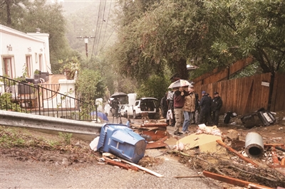 美国加利福尼亚州近日遭遇“大气河”现象及冬季风暴引发的强降雨、暴雪及大风等极端天气。恶劣天气引发泥石流、洪水等自然灾害,导致建筑受损、电力中断。图为2月6日,媒体工作人员在报道极端天气情况。 新华社发