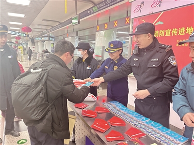 结合当前春运高峰,近日,北京市消防救援总队轨道交通支队在“七站两场”涉及换乘地铁站点等重点车站开展消防宣传进地铁活动。活动现场,消防宣传员为进站候车的市民乘客讲解冬季安全用火和用电、家庭火灾预防、电动车充电等消防知识,同时将印有消防安全提示的“平安福”作为新春礼物赠送给乘客。 本报记者 周美玉 摄影报道