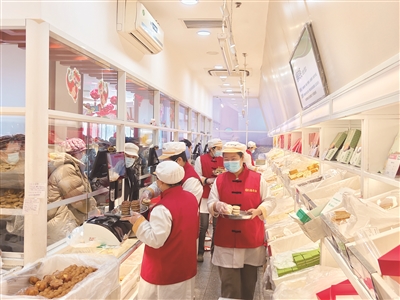 记者昨天在北京稻香村“东城食尚店”看到,店内一派红火场面,不少顾客拉着行李箱直奔门店选购,还有顾客选好礼品直接快递寄走。据工作人员介绍,近两周稻香村在北京地区的门店客流量近600万人次,每日销售近300吨。