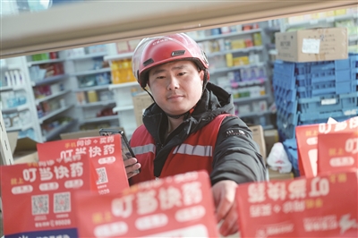 大年初七,叮当快药九棵树店配送站站长苗跃峰依然骑着电动车穿行在通州区玉桥地区的大街小巷。从事药品配送工作7年,苗跃峰对周边社区环境谙熟于心,甚至不需要导航,就能预判出哪条线路更近、车辆更少,确保在文明骑行、安全出行的前提下,快速将药品送达客户手中。