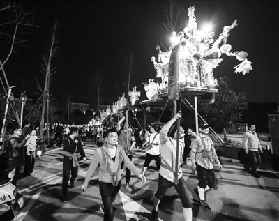每年元宵节前后,浙江省金华市金东区澧浦镇的村民都会舞起板凳龙灯,祈求来年风调雨顺、五谷丰登。图为在澧浦镇里新村,村民们抬着长长的传统板凳龙在村落中穿行。