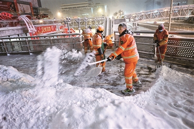 2月20日,本市出现降雪天气。记者从市城管委了解到,截至2月21日6时,全市连夜出动专业作业人员4.5万人次,出动扫雪铲冰作业车辆6493车次,动用机械除雪设备4164台套、人工除雪设备2.9万个。