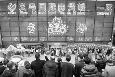 2月21日,全球最大的小商品集散中心义乌中国小商品城迎来节后开市,经营户与来自世界各地的客商开启新一年的贸易活动。图为义乌国际商贸城举办新春开市舞龙表演。 新华社发