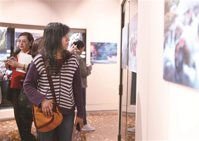 由墨西哥中国文化中心联合张家界市人民政府、墨西哥卡兰萨博物馆主办的张家界风光展近日在墨西哥城举办。活动现场展出的图片中,峰林峡谷、溶洞温泉、原始森林等自然风光美不胜收,土家花灯、演艺大戏、摆手舞等民间文艺活动引人入胜,吸引不少民众驻足观赏。图为参观者观赏张家界风光照片。
