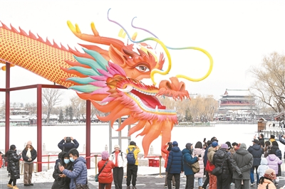 正月期间,北京的大街小巷张灯结彩,处处洋溢着祥和的氛围。在什刹海畔,长达202.4米的巨型龙灯“蛟龙出海”蜿蜒盘旋,寓意“2024龙腾四海”,引得众多游客纷纷拍照留念。