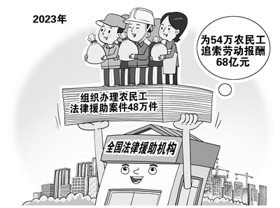 记者26日从司法部获悉,通过深入开展“法援惠民生 助力农民工”等活动,2023年全国法律援助机构共组织办理农民工法律援助案件48万件,为54万农民工追索劳动报酬68亿元,有效维护了农民工合法权益。(2月26日 新华社)