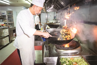 倒油、撒料、翻炒,火苗围着锅边“噗噗”作响,厨师一手握紧锅把迅速颠炒,一手快速调节火力,整个厨房内弥漫着浓浓的香味。“出锅!”话音未落,帮厨已将洗净的餐盆摆放到灶台旁,准备接菜。