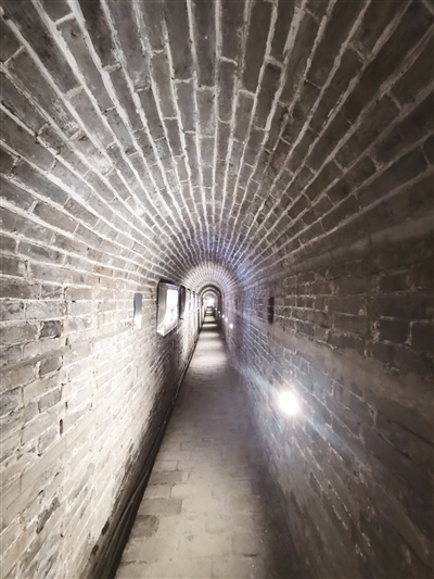 战道内岔道分布,迂回曲折,纵横交错,连通4个城门楼及周边村落,是一个四通八达的地下交通网。在我看来,古战道内俨然是一个功能齐全、设施完备的“小社会”,它的边侧有流水槽,墙壁有灯台,顶部有通风孔,地道内还有深水井,战道两侧还有藏兵室、兵器室、指挥室,里面不仅有刀、枪、剑、戟,还有斧、钺、钩、叉等兵器,不仅有桌子、椅子、土炕等生活设施,还有石臼、石磨、水缸等生活物品。