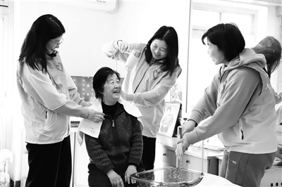 近日,顺义区胜利街道学雷锋志愿服务小组来到胜利街道建新北区第二社区80岁的杨秀琴老人家中,为老人开展义务洗发和精神慰藉服务。当天,社区养老驿站工作人员和青年志愿者为多名空巢、失能老人开展理发、按摩等义务助洁服务,让老人在家就能感受到“从头到脚”的贴心呵护。本报记者 王路曼 摄影报道
