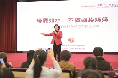 据悉,“温情三月,呵护心灵”首都女职工心理关爱服务周已持续开展多年,活动聚焦女职工实际需求,每年都会进行优化调整。今年,围绕女职工最关心的亲子关系、家庭沟通、职家平衡、身心健康、职场形象等话题,开设了女职工幸福大讲堂,邀请相关领域“大咖”前来授课。首场大讲堂上,著名家庭教育专家、中国少年儿童新闻出版总社原总编辑卢勤以“母爱如水:不做强势妈妈”为题,通过大量鲜活的案例,引导女职工习得温和坚定的教养方式,建立和谐亲子关系。卢勤精彩、生动的讲授引得台下掌声阵阵,两个小时的讲座,大家听得意犹未尽,一名女职工说:“这堂课帮我解决了实际困惑,是我收到最有意义的节日礼物。”