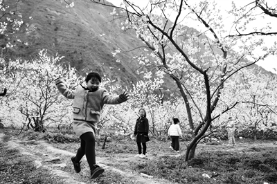 近日,甘肃省陇南市武都区城关镇石家庄村的樱桃树进入盛花期,漫山遍野的樱桃花竞相绽放,吸引了众多市民和游客前来踏青赏花。图为几名小朋友在樱桃树下玩耍。新华社发