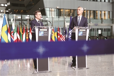 2022年2月乌克兰危机升级后,瑞典和芬兰于同年5月同时申请加入北约。芬兰已于2023年4月正式获准加入北约。图为瑞典首相克里斯特松(左)和北约秘书长斯托尔滕贝格出席联合新闻发布会。