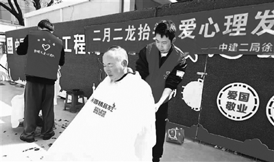 日前,中建二局华东公司徐汇乔高综合体项目部特地开展了主题为“二月二龙抬头,爱心理发好兆头”的爱心理发服务进工地活动,邀请志愿者理发师走进工地,为百余位一线职工理发。(3月12日《劳动报》)