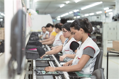 TCL巴西公司(SEMP TCL)是中国电子产品制造商TCL和巴西公司SEMP成立的合资企业。公司位于马瑙斯的电视机工厂占地面积达6.3万平方米,雇佣当地员工1000余名。工厂带来先进的生产技术和管理经验,为当地消费者提供了更多优质、实惠的家电产品选择,促进了供应链、物流和服务业的整体发展,推动了当地相关产业的技术升级和提高。图为工作人员在位于巴西亚马孙州马瑙斯的TCL电视机工厂生产线上工作。