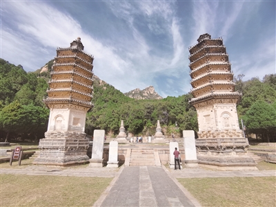 银山,因峰峦高峻,冰雪层积,色如白银,所以称为“银山”。山麓中有石崖,色如黑铁,称为“铁壁”。银山铁壁,一白一黑,风景独特,为明清时期燕平八景之一。据了解,自唐贞观年间开始,银山始建寺院,辽、金、明、清时代,银山寺院云集,有大小寺院庵堂百余所,其中法华寺是最大的一座。自唐宪宗元和年间始,历代名僧、禅师相继来此,禅师圆寂及大小沙弥死后,按僧人在佛门的等级、地位,在银山山麓及附件的法华禅寺院内建灵塔,火化入藏,形成的塔群统称“银山塔林”,现存古塔19座,高的有20多米,矮些的也有2米多。从塔的形制上看,大体上可分为两大类,一类为密檐式塔,一类为覆钵式塔。