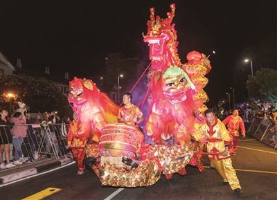 2024年开普敦狂欢节近日在南非立法首都开普敦拉开帷幕。富有中国传统文化特色的华侨华人方阵闪亮登场,令中国元素在狂欢节上耀眼夺目。开普敦狂欢节源于2010年世界杯,此后每年举行一次,如今已成为当地一张亮丽名片。图为中国方阵的花车参加开普敦狂欢节游行。 新华社发