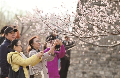 初春时节,北京明城墙遗址公园内的梅花、山桃花、迎春花等逐步进入盛花期,大批市民前来赏春、拍照,感受春天的气息。