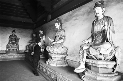 到法兴寺参观的游客越来越多,张宇飞的故事渐渐被人知晓。30年间,张宇飞累计接待国内外游客、各类团体超过50万人次,讲解2万余次。“这些文物早就是我生命的一部分了。每次看寺内的塑像都是一场跨越时空的交流,能从中看到古人的智慧与中华文化的博大精深。我很乐意和游客分享我看到的一切。”张宇飞希望更多人参与到文物保护中来,共同挖掘传统文化的魅力。图为在法兴寺圆觉殿,张宇飞记录宋代彩塑的保存状况。