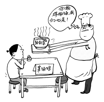 “点了一碗牛丸牛杂面,本以为吃的是现场制作的牛丸、牛杂,结果端上来发现全是预制菜。”“我去饭馆是懒得做饭,没想到饭馆都懒得做饭了……”刚刚过去的“3·15”,有关预制菜的话题再度引人关注。有消费者反映,许多菜品虽然是“现做”,食材却不一定是“现做”。(3月18日 《北京日报》)□王铎