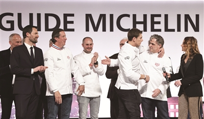 近日,2024《米其林指南》法国版在法国中央-卢瓦尔河谷大区图尔市发布,新增两家米其林三星餐馆,8家米其林二星餐馆,52家米其林一星餐馆。图为在法国中央-卢瓦尔河谷大区图尔市举行的2024《米其林指南》法国版发布典礼上,获颁米其林三星的法国厨师法比安·菲埃(右三)和热罗姆·邦克泰尔(右二)相拥庆祝。