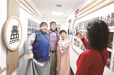 “咱们老姐妹在这合张影吧。”唐女士是北京市曲剧团的忠实粉丝。“年轻时我就喜欢看北京曲剧。上岁数了,要带孙子,这个爱好就放下了。”不久前,她重拾了这个兴趣,约上闺蜜走进剧场欣赏北京曲剧。
