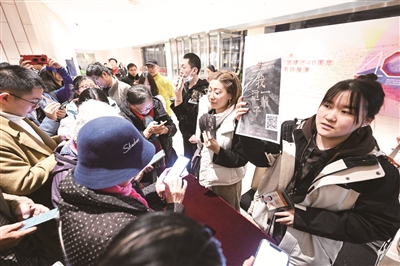 距离演出开始还有一个小时,按捺不住激动心情的剧迷们纷纷赶来。换票处前排起了长龙,大家迫不及待地想要近距离感受曲剧的魅力。剧场入口处,写有“北京市曲剧团建团40周年优秀剧目展演”的展板吸引了不少观众的驻足,人们或拍照,或写下对剧团、北京曲剧的寄语。