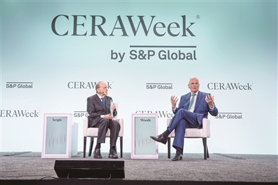 国际能源界高端会议“剑桥能源周”3月18日在美国休斯敦开幕,今年的主题是“多维能源转型:市场、气候、技术和地缘政治”。多家大型石油公司负责人当天发言,探讨地缘政治紧张、气候变化加剧等多重挑战下油气企业的战略调整。图为标普全球公司副主席丹尼尔·耶金(左)和埃克森美孚首席执行官达伦·伍兹在美国休斯敦举行的能源界高端会议“剑桥能源周”上分享观点。 新华社发