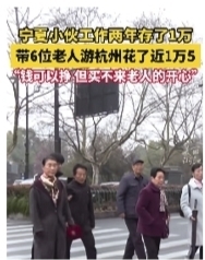 近日,一位已经在杭州工作两年的宁夏小伙征浩,一次性花光两年积蓄,带着老家的爷爷奶奶等6位老人来到杭州,带老人们在杭州玩几天。这对入职不久、经济不宽裕的年轻人来说是一笔不小的开支。但思前想后,小征还是觉得,家里的老人一天天老了,这趟行程,不能再等了。小伙表示:“钱可以挣 但老人开心买不来!”