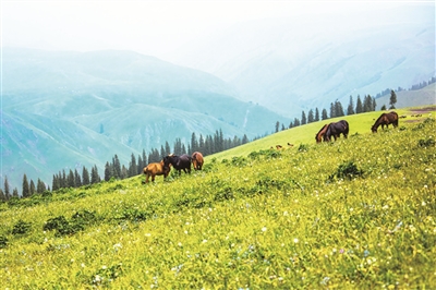 车入西天山风景区,满目林海草甸,翠绿如毯跌宕,一边是绿油油沃野农田,谷麦、豆类、油菜、花生、葵花、甜菜作物碧波万顷;另一边是那拉提崇山峻岭,势如天然屏障。天山群峰巍峨,林草植被茂密,莽原若带展缓起伏,松塔沿沟擎柱,自河谷至峰顶长满了翠松,谁也不与兀峰争雄,谁也不与春色争浓。